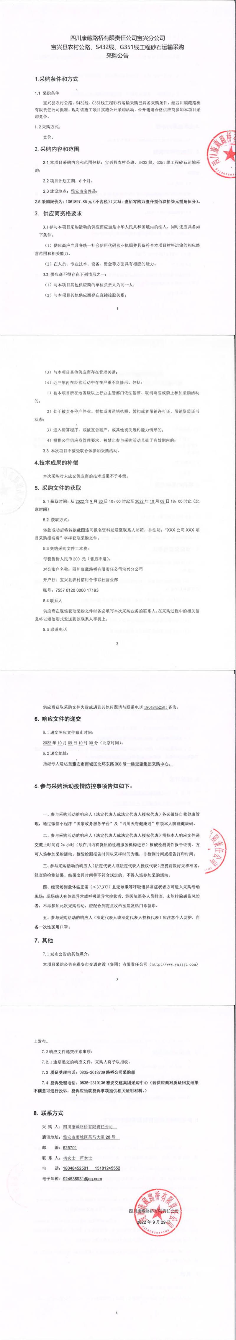 四川康藏路橋有限責任公司寶興分公司寶興縣農村公路、S432線、G351線工程砂石運輸采購采購公告