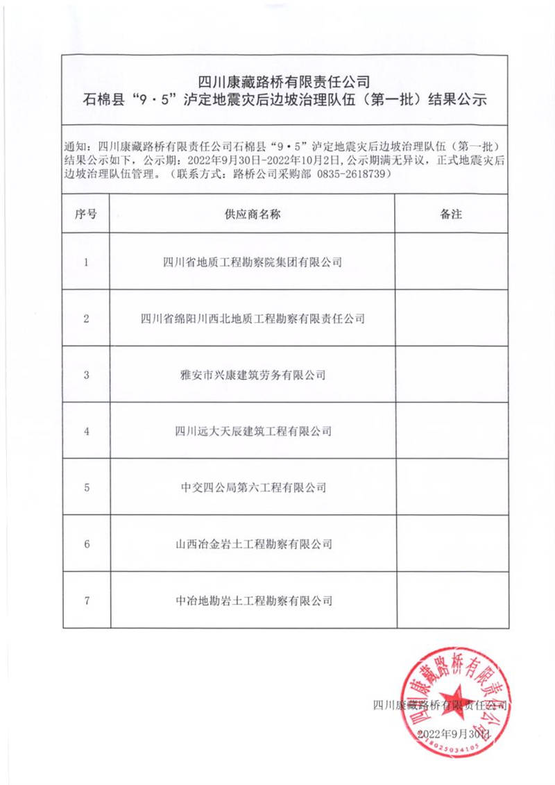 四川康藏路橋有限責任公司石棉縣“9.5”瀘定地震災后邊坡治理隊伍(第一批)結(jié)果公示