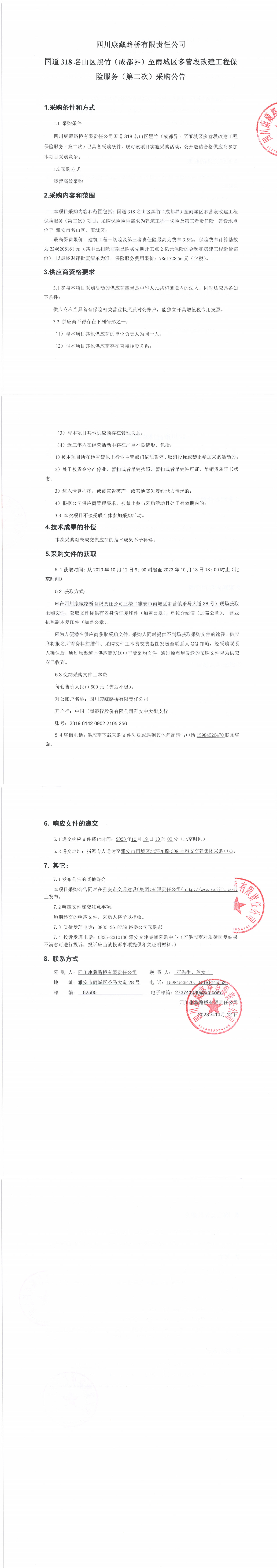四川康藏路橋有限責(zé)任公司國道318名山區(qū)黑竹(成都界)至雨城區(qū)多營段改建工程保險(xiǎn)服務(wù)(第二次)采購公告