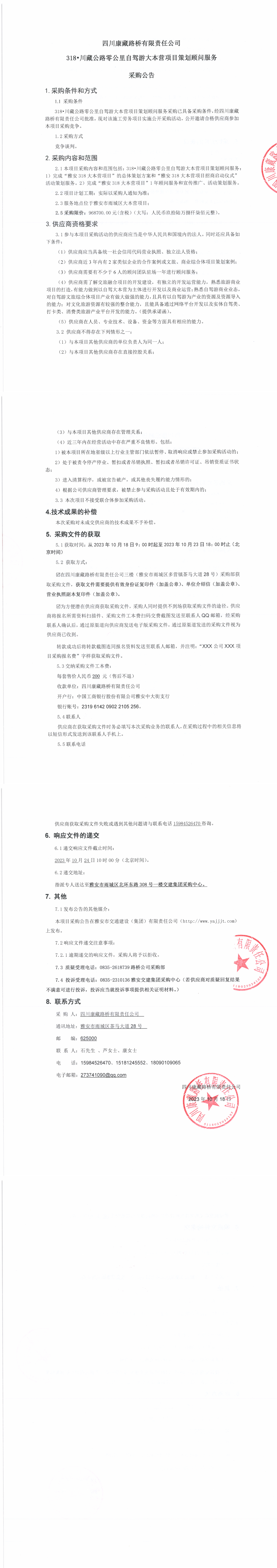 四川康藏路橋有限責(zé)任公司318•川藏公路零公里自駕游大本營項目策劃顧問服務(wù)采購公告