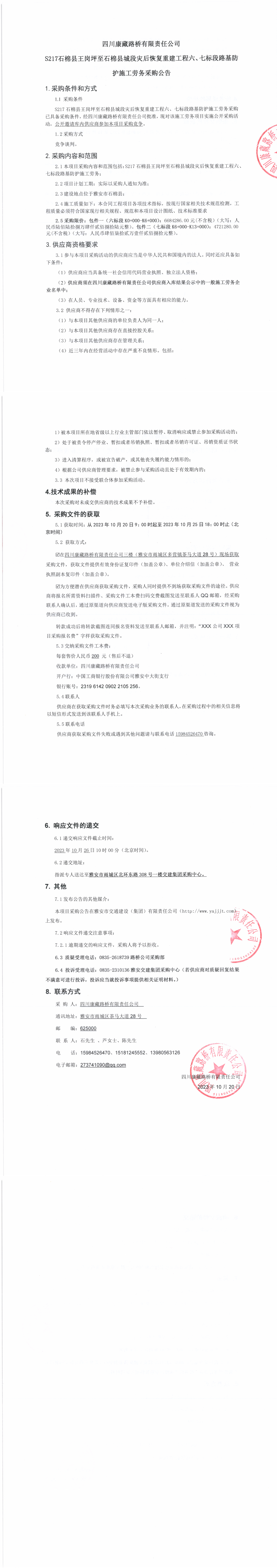 四川康藏路橋有限責任公司S217石棉縣王崗坪至石棉縣城段災后恢復重建工程六、七標段路基防護施工勞務采購公告