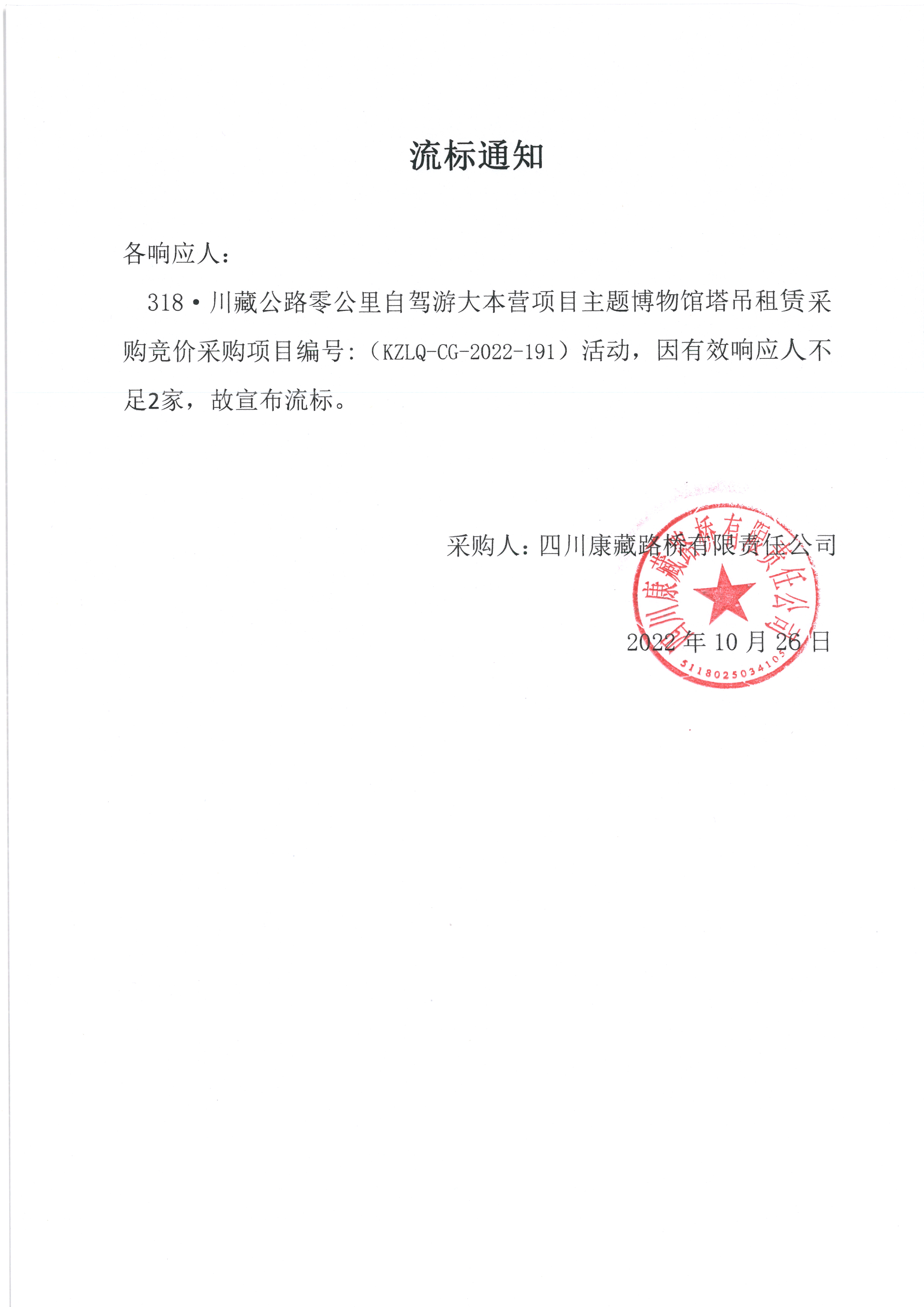 四川康藏路橋有限責(zé)任公司318·川藏公路零公里自駕游大本營(yíng)項(xiàng)目主題博物館塔吊租賃采購(gòu)流標(biāo)通知
