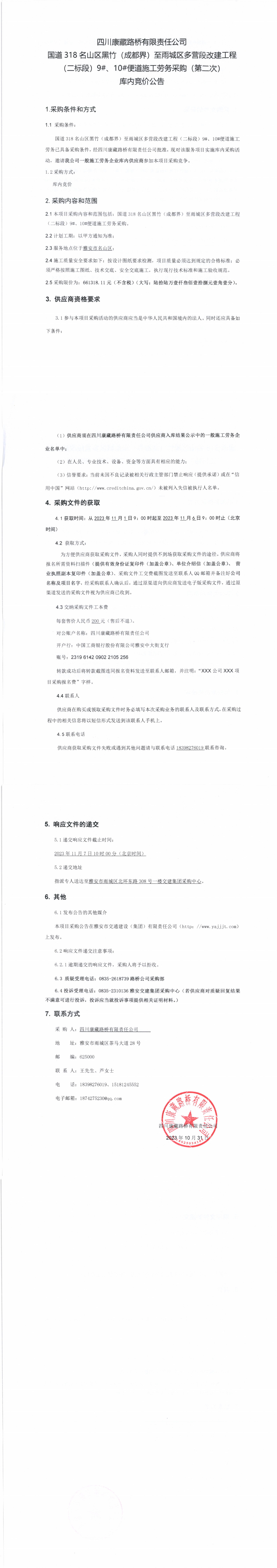 四川康藏路橋有限責任公司國道318名山區(qū)黑竹(成都界)至雨城區(qū)多營段改建工程(二標段)9#、10#便道施工勞務采購(第二次)庫內(nèi)競價公告