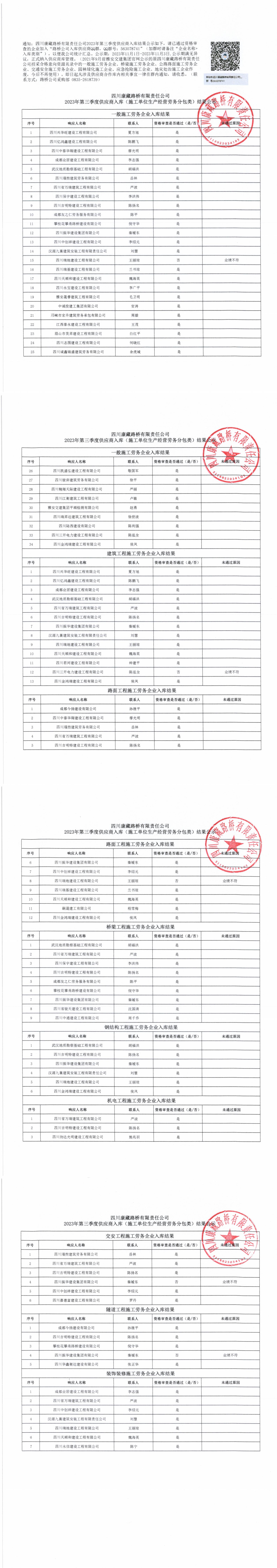 四川康藏路橋有限責(zé)任公司2023年第三季度供應(yīng)商入庫(施工單位生產(chǎn)經(jīng)營(yíng)勞務(wù)分包類)結(jié)果公示
