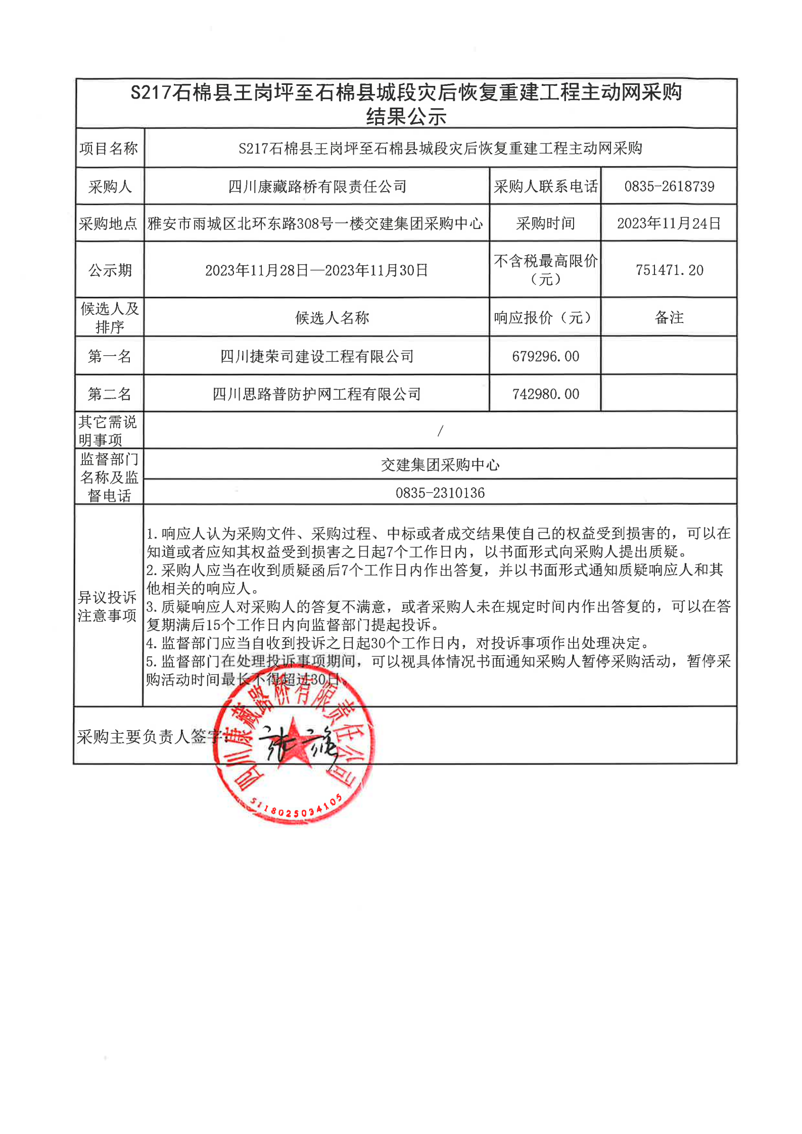 四川康藏路橋有限責(zé)任公司S217石棉縣王崗坪至石棉縣城段災(zāi)后恢復(fù)重建工程主動(dòng)網(wǎng)采購結(jié)果公示