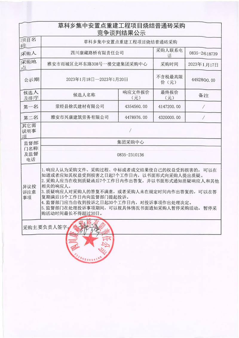 四川康藏路橋有限責任公司草科鄉(xiāng)集中安置點重建工程項目燒結普通磚采購競爭談判結果公示
