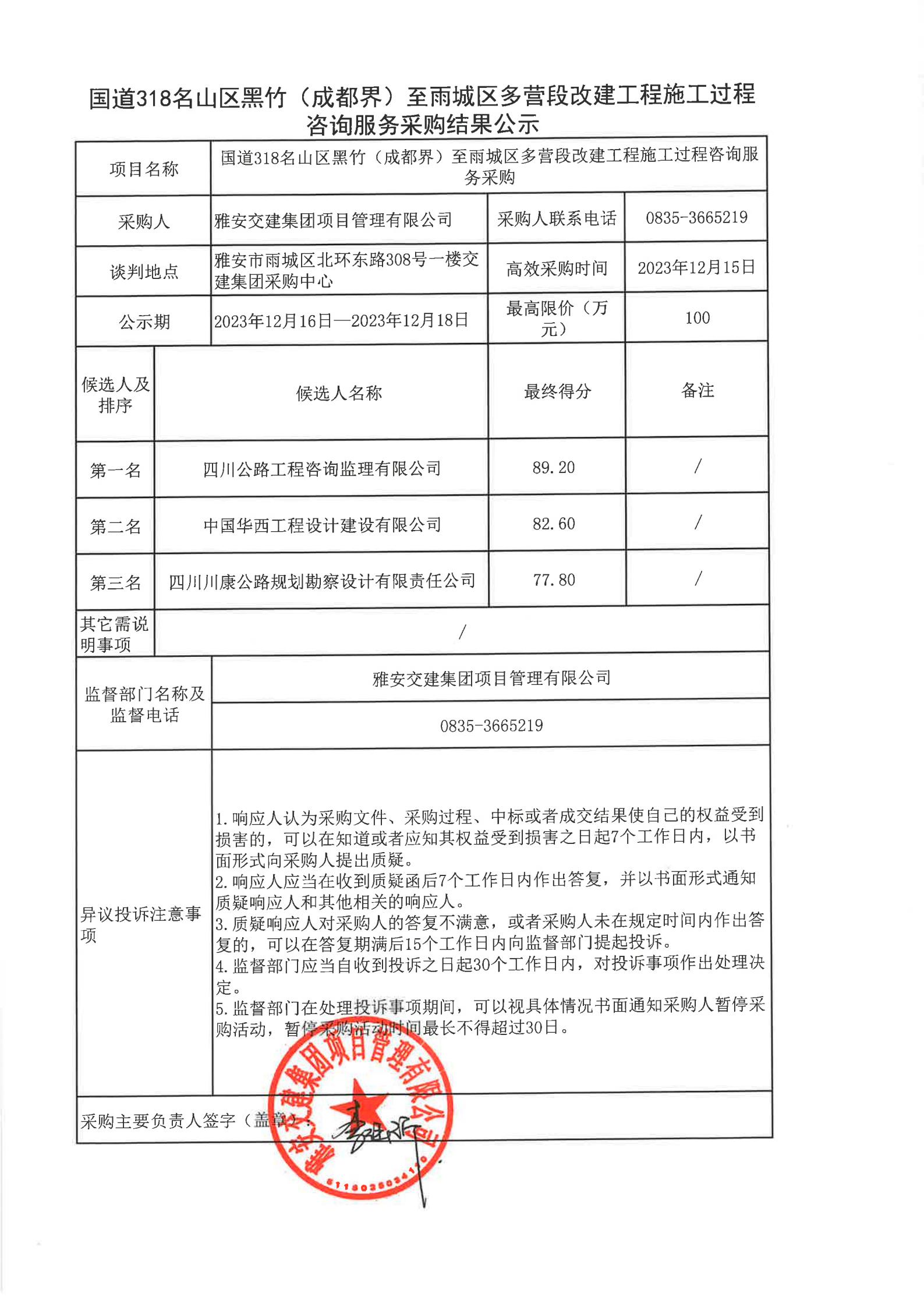 雅安交建集團項目管理有限公司國道318名山區(qū)黑竹(成都界)至雨城區(qū)多營段改建工程施工過程咨詢服務(wù)采購結(jié)果公示