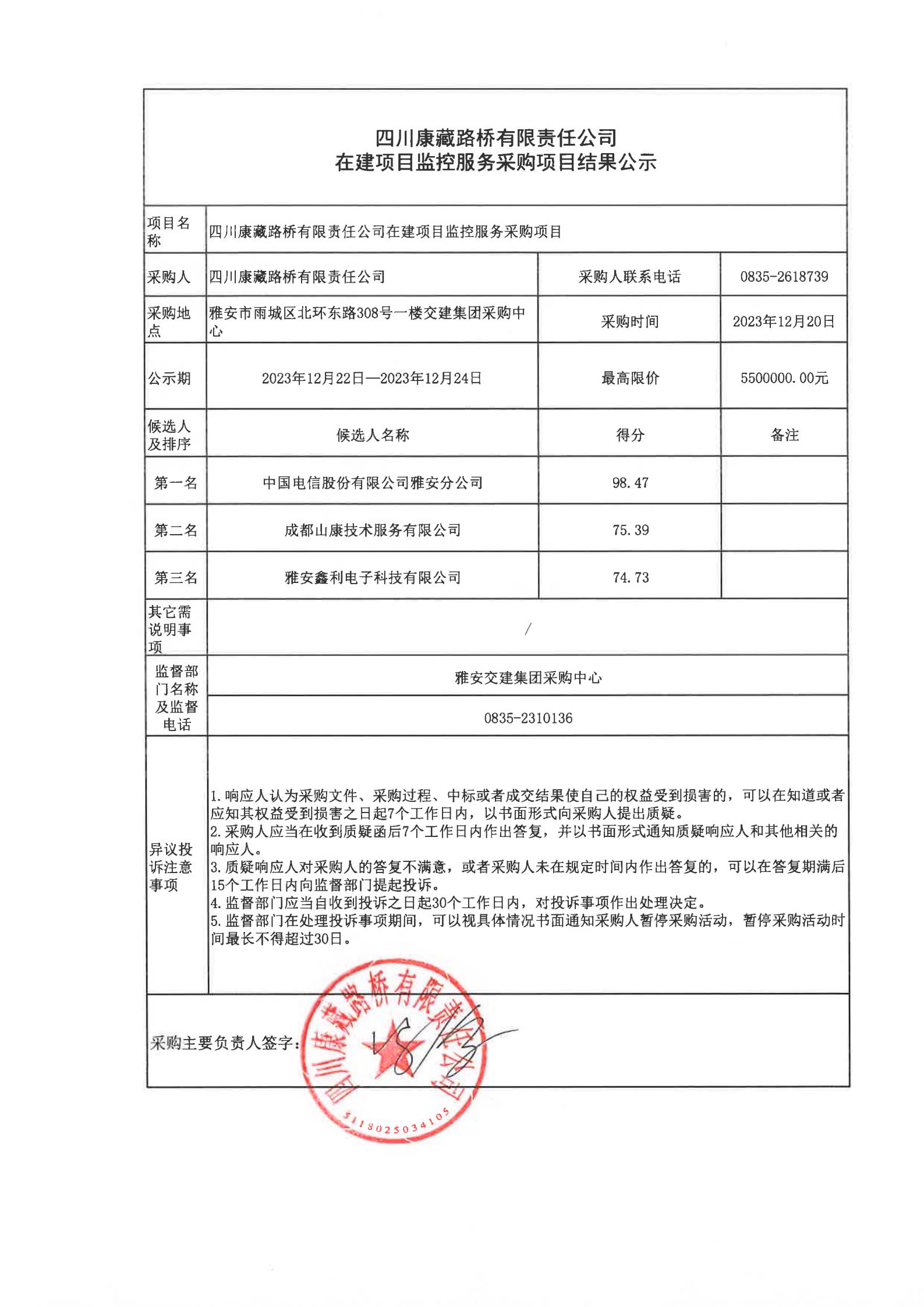 四川康藏路橋有限責(zé)任公司在建項(xiàng)目監(jiān)控服務(wù)采購(gòu)項(xiàng)目結(jié)果公示