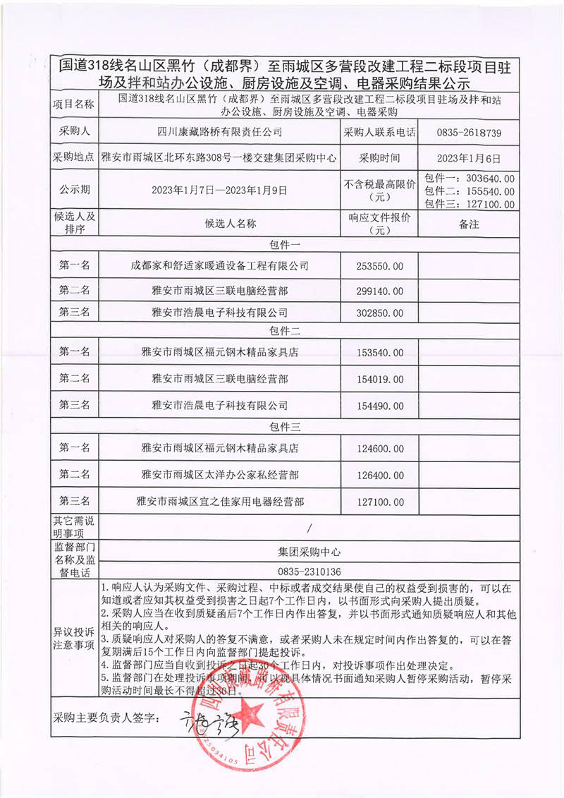 四川康藏路橋有限責任公司國道318線名山區(qū)黑竹(成都界)至雨城區(qū)多營段改建工程二標段項目駐場及拌和站辦公設施、廚房設施及空調(diào)、電器采購結(jié)果公示