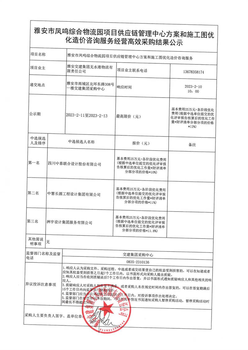 雅安交建集團(tuán)無水港物流有限責(zé)任公司雅安市鳳鳴綜合物流園項(xiàng)目供應(yīng)鏈管理中心方案和施工圖優(yōu)化造價咨詢服務(wù)經(jīng)營高效采購結(jié)果公示