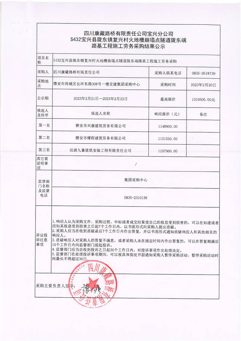 四川康藏路橋有限責(zé)任公司寶興分公司S432寶興縣隴東鎮(zhèn)復(fù)興村火地槽崩塌點隧道隴東端路基工程施工勞務(wù)采購結(jié)果公示