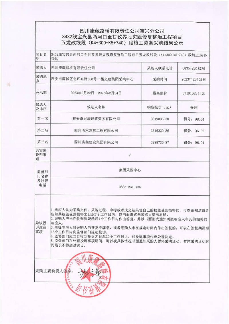 四川康藏路橋有限責任公司寶興分公司S432寶興縣兩河口至甘孜界段災毀修復整治工程項目五龍改線段(K4+300-K5+740)段施工勞務采購結果公示
