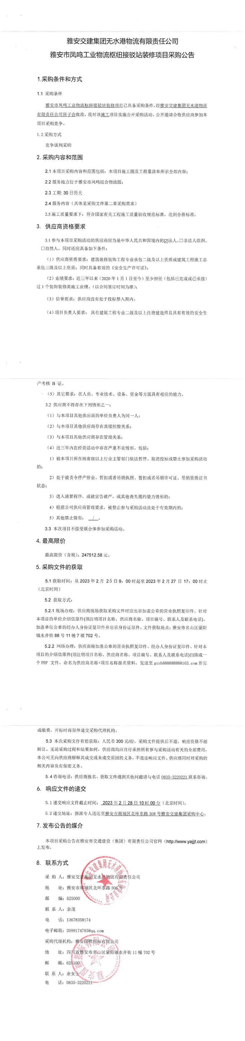 雅安交建集團(tuán)無水港物流有限責(zé)任公司雅安市鳳鳴工業(yè)物流樞紐接駁站裝修項目采購公告