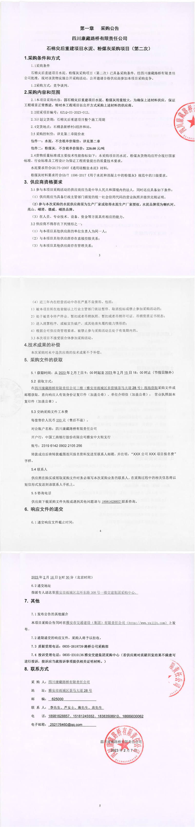 四川康藏路橋有限責(zé)任公司石棉災(zāi)重建項(xiàng)目水泥、粉煤灰采購項(xiàng)目(第二次)采購公告