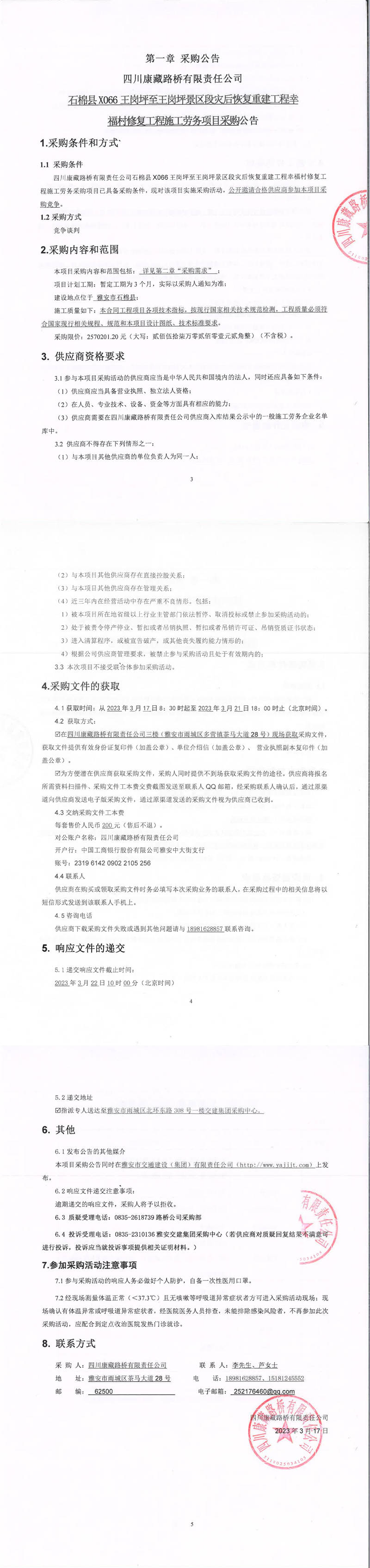 四川康藏路橋有限責任公司石棉縣X066王崗坪至王崗坪景區(qū)段災(zāi)后恢復(fù)重建工程幸福村修復(fù)工程施工勞務(wù)項目采購公告