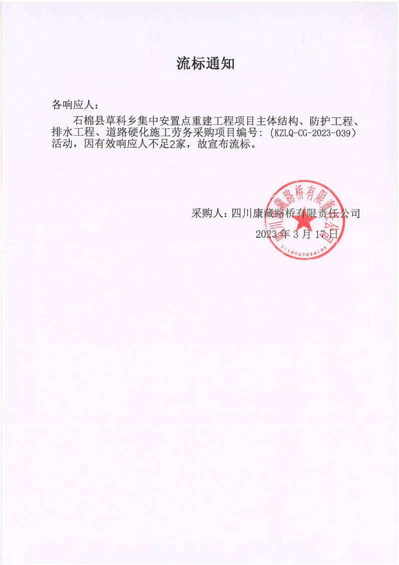 四川康藏路橋有限責任公司石棉草科鄉(xiāng)集中安置點重建工程項目主體結構、防護工程、排水工程、道路硬化施工勞務采購流標通知