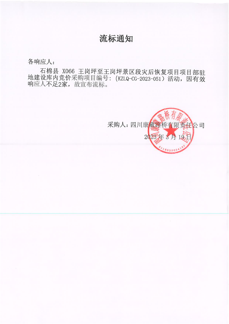 四川康藏路橋有限責(zé)任公司石棉縣X066王崗坪至王崗坪景區(qū)段災(zāi)后恢復(fù)項目項目部駐地建設(shè)庫內(nèi)競價采購流標(biāo)通知