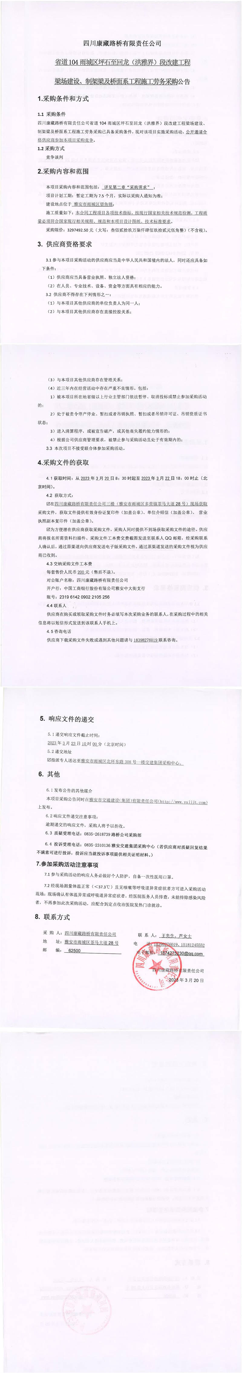 四川康藏路橋有限責(zé)任公司省道104雨城區(qū)坪石至回龍(洪雅界)段改建工程梁場建設(shè)、制架梁及橋面系工程施工勞務(wù)采購公告