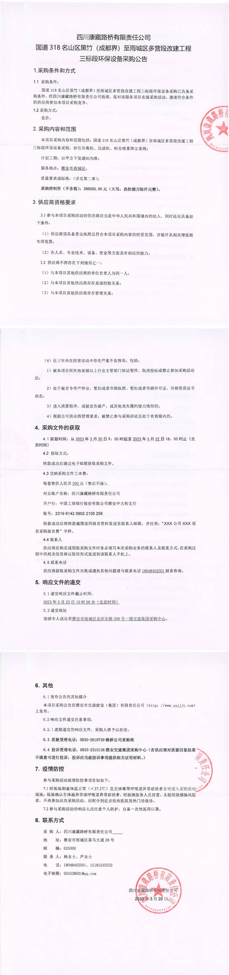 四川康藏路橋有限責(zé)任公司國道318名山區(qū)黑竹(成都界)至雨城區(qū)多營段改建工程三標段環(huán)保設(shè)備采購公告