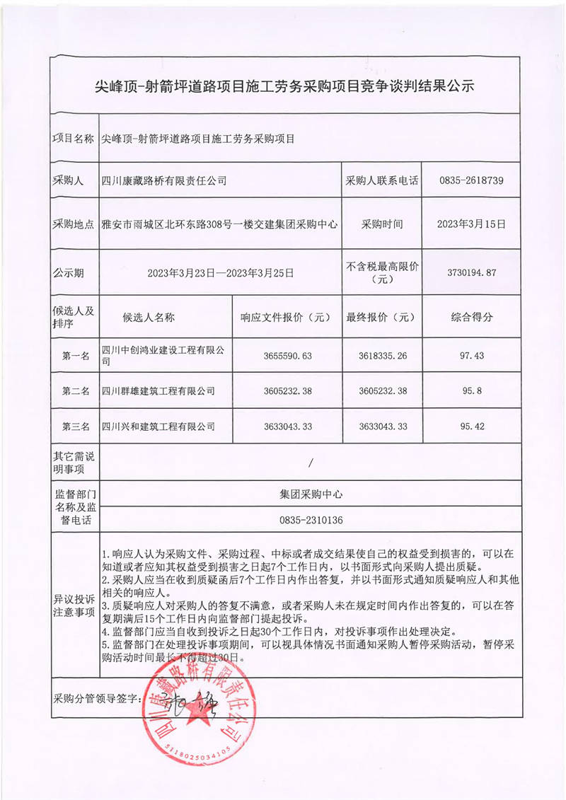 四川康藏路橋有限責(zé)任公司尖峰頂-射箭坪道路項目施工勞務(wù)采購項目競爭談判結(jié)果公示