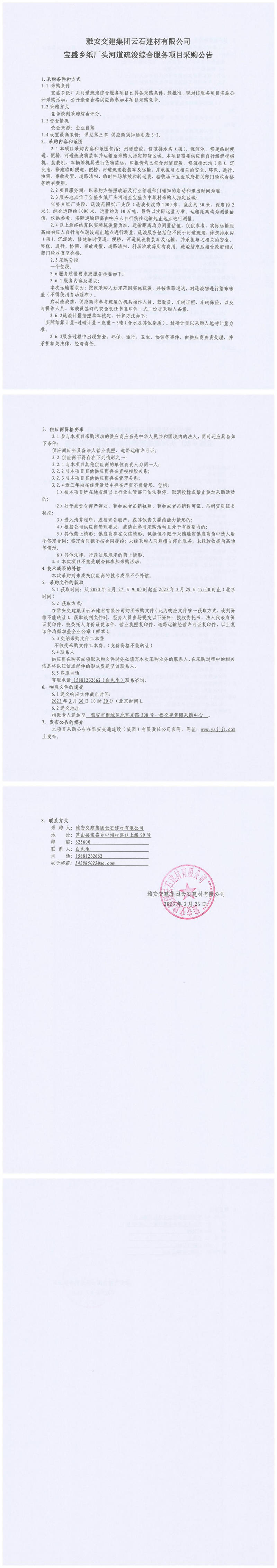 雅安交建集團(tuán)云石建材有限公司寶盛鄉(xiāng)紙廠頭河道疏浚綜合服務(wù)項(xiàng)目采購(gòu)公告