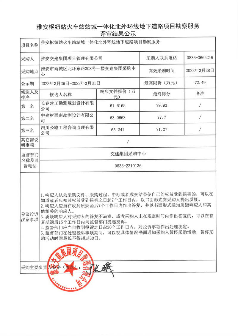 雅安交建集團項目管理有限公司雅安樞紐站火車站站城一體化北外環(huán)線地下道路項目勘察服務評審結果公示
