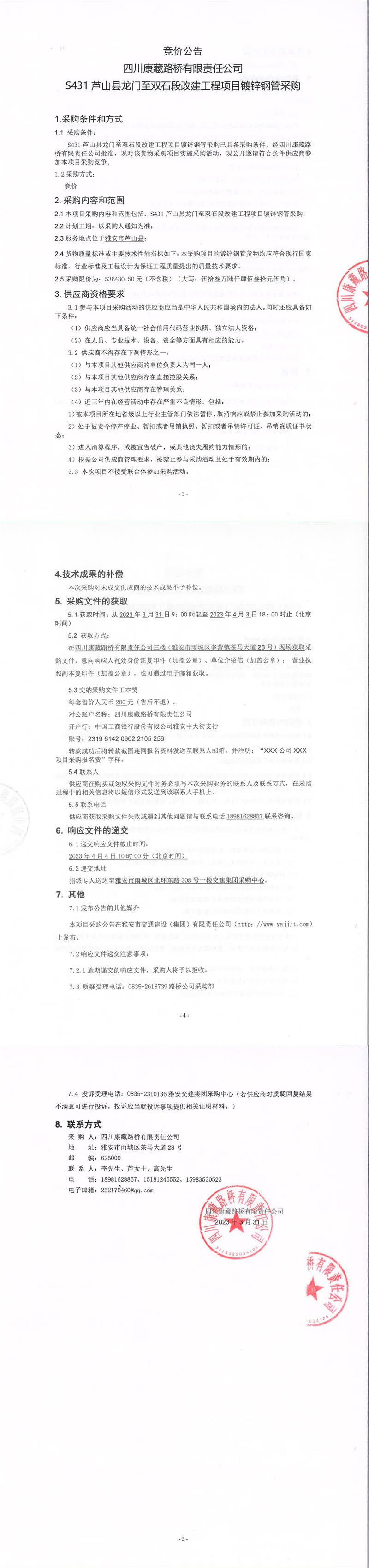 四川康藏路橋有限責(zé)任公司S431蘆山縣龍門(mén)至雙石段改建工程項(xiàng)目鍍鋅鋼管采購(gòu)競(jìng)價(jià)公告