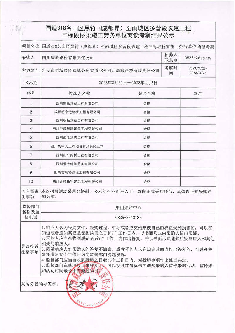 四川康藏路橋有限責任公司國道318名山區(qū)黑竹(成都界)至雨城區(qū)多營段改建工程三標段橋梁施工勞務(wù)單位商談考察結(jié)果公示