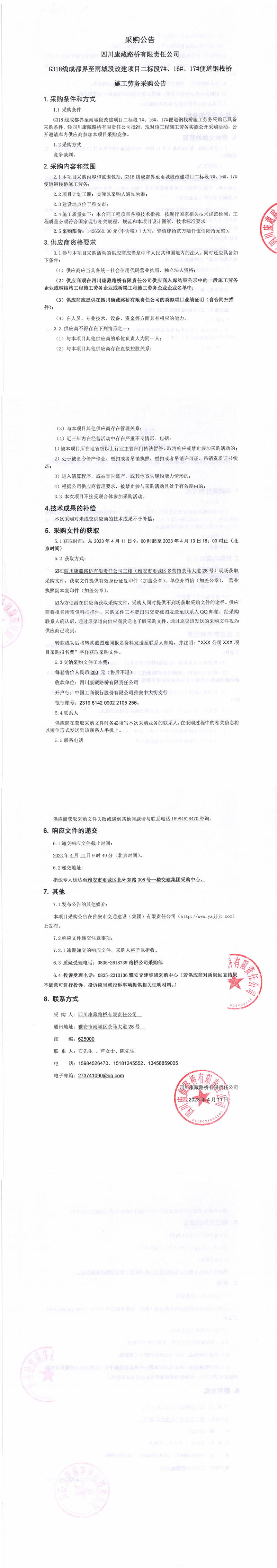 四川康藏路橋有限責(zé)任公司G318線成都界至雨城段改建項(xiàng)目二標(biāo)段7#、16#、17#便道鋼棧橋施工勞務(wù)采購公告