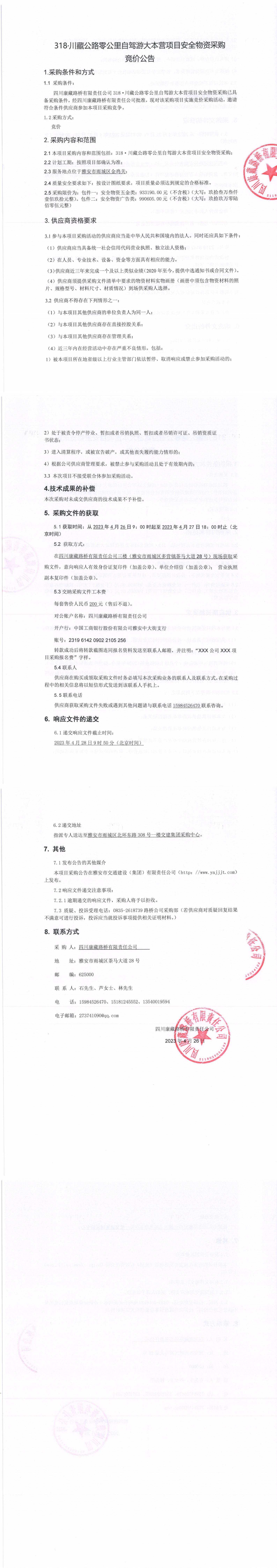 四川康藏路橋有限責(zé)任公司318·川藏公路零公里自駕游大本營項(xiàng)目安全物資采購競價(jià)公告