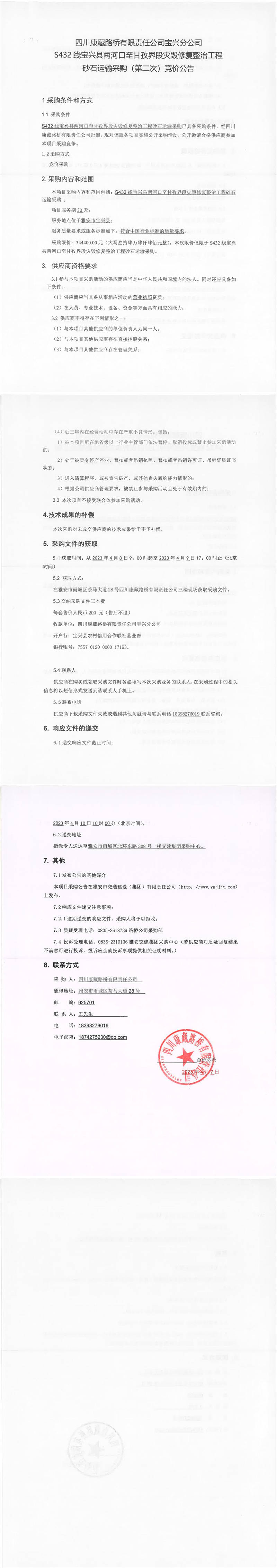 四川康藏路橋有限責任公司寶興分公司S432寶興縣兩河口至甘孜界段災(zāi)毀修復(fù)整治工程砂石運輸采購(第二次)競價公告