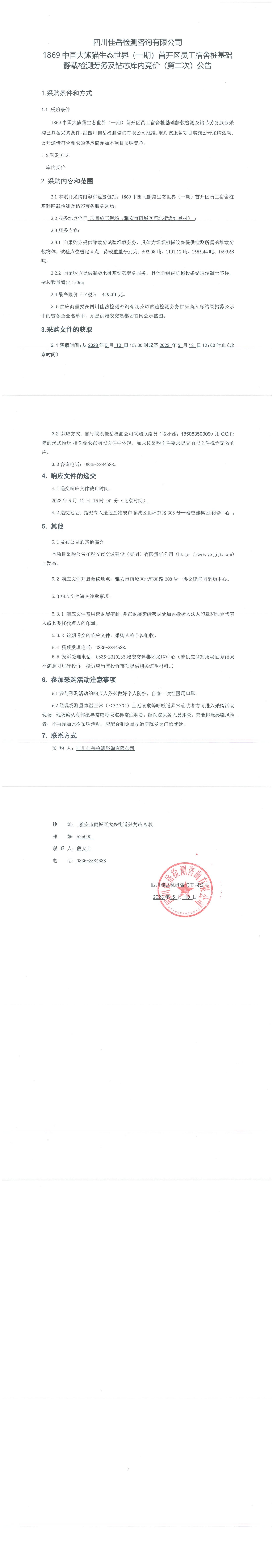 四川佳岳檢測(cè)咨詢有限公司1869中國大熊貓生態(tài)世界(一期)首開區(qū)員工宿舍樁基礎(chǔ)靜載檢測(cè)勞務(wù)及磚芯庫內(nèi)競價(jià)(第二次)采購公告