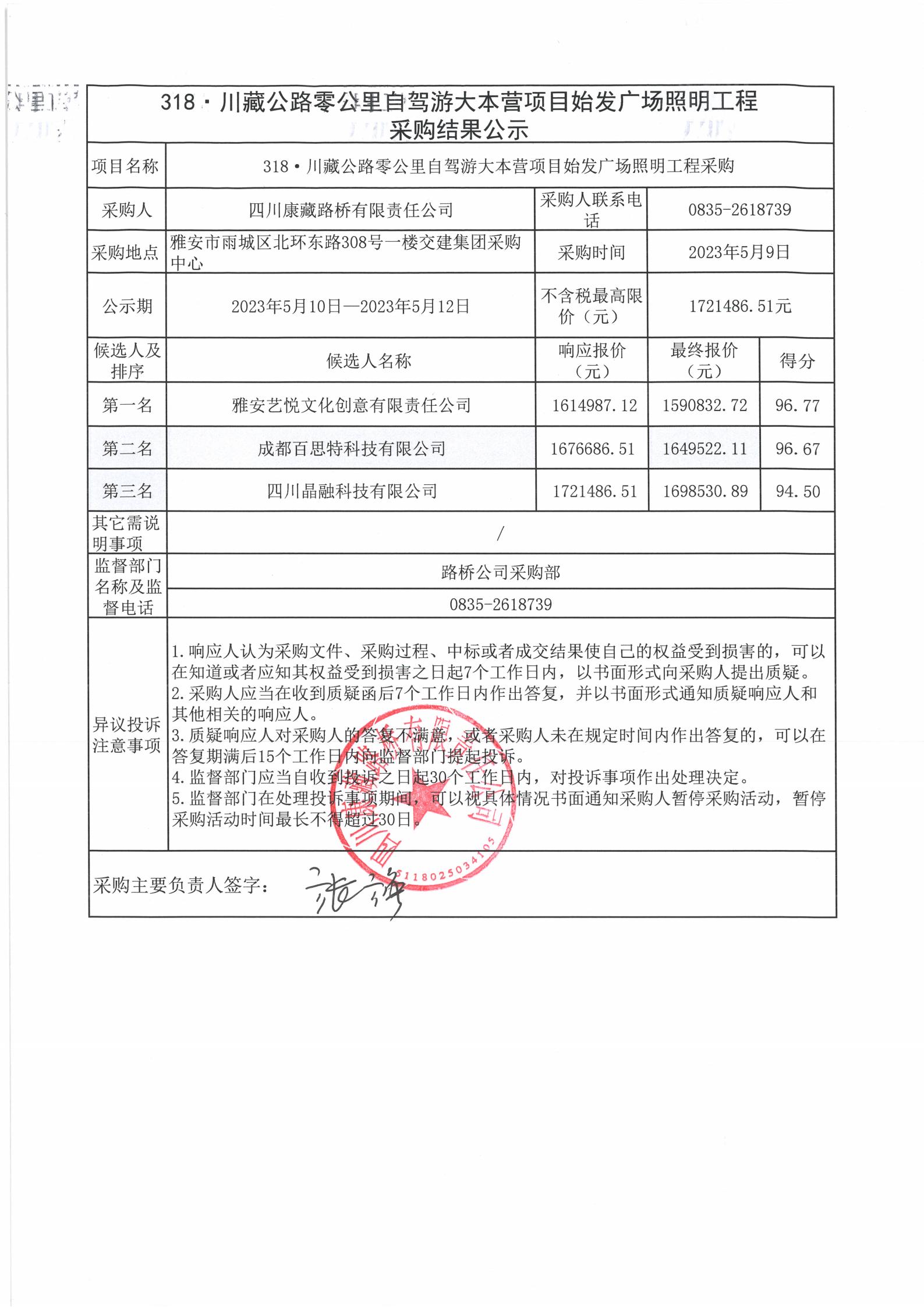 四川康藏路橋有限責(zé)任公司318·川藏公路零公里自駕游大本營項(xiàng)目始發(fā)廣場(chǎng)照明工程采購結(jié)果公示