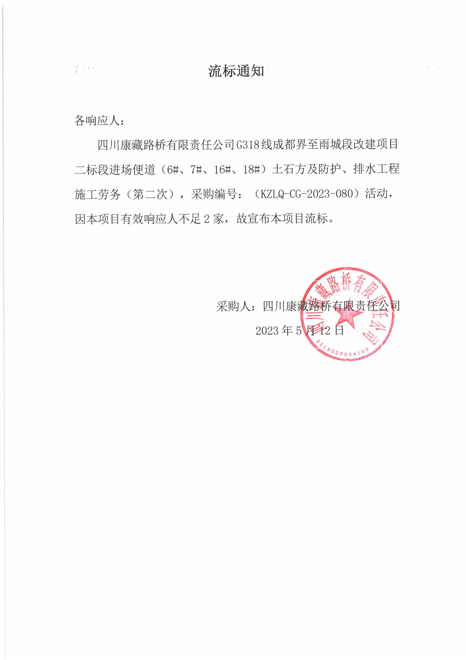 四川康藏路橋有限責任公司G318線成都至雨城段改建項目二標段進場便道(6#、7#、16#、18#)土石方及防護、排水工程施工勞務(第二次)流標通知