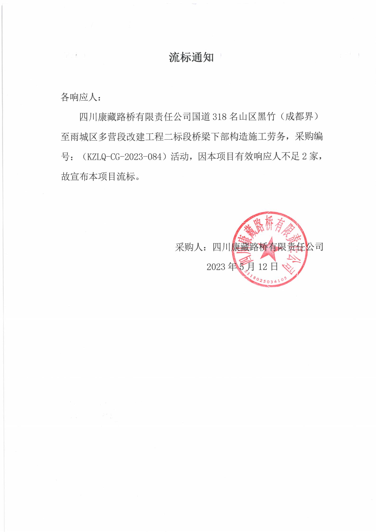 四川康藏路橋有限責(zé)任公司國道318名山區(qū)黑竹(成都界)至雨城區(qū)多營(yíng)段改建工程二標(biāo)段橋梁下部構(gòu)造施工勞務(wù)流標(biāo)通知