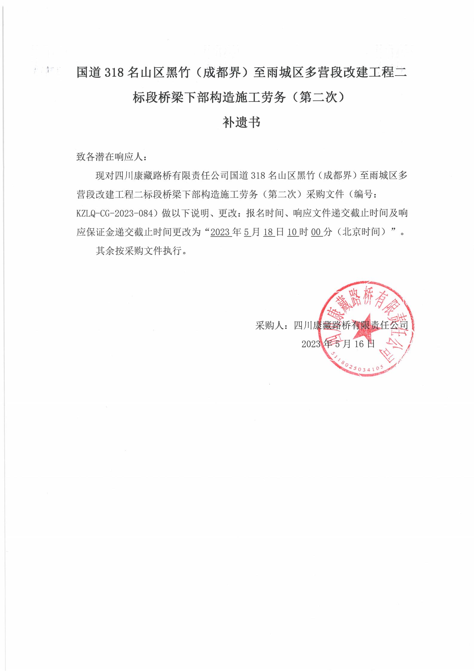 四川康藏路橋有限責任公司國道318名山區(qū)黑竹(成都界)至雨城區(qū)多營段改建工程二標段橋梁下部構(gòu)造施工勞務(第二次)補遺書