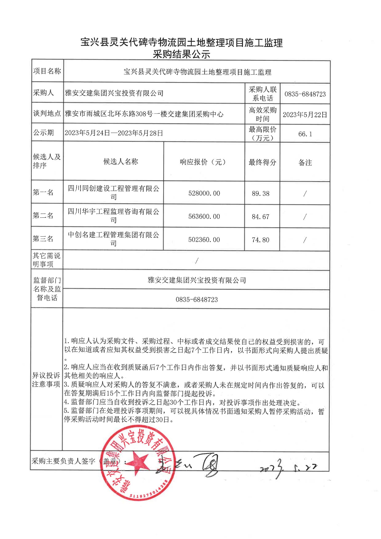 雅安交建集團興寶投資有限公司寶興縣靈關(guān)代碑寺物流園土地整理項目施工監(jiān)理采購結(jié)果公示