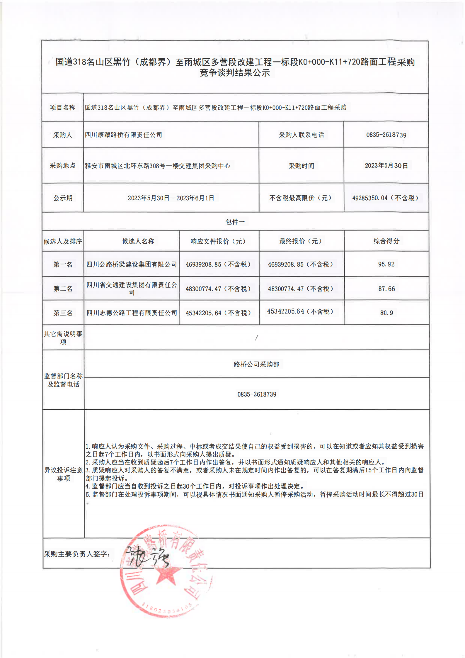 四川康藏路橋有限責(zé)任公司國道318名山區(qū)黑竹(成都界)至雨城區(qū)多營段改建工程一標段K0+000-K11+720路面工程采購競爭談判結(jié)果公示