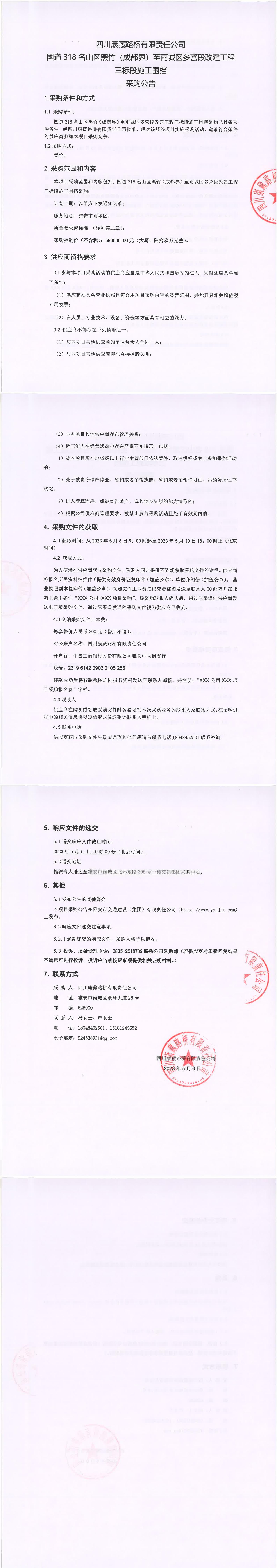 四川康藏路橋有限責(zé)任公司國道318名山區(qū)黑竹(成都界)至雨城區(qū)多營段改建工程三標(biāo)段施工圍擋采購公告