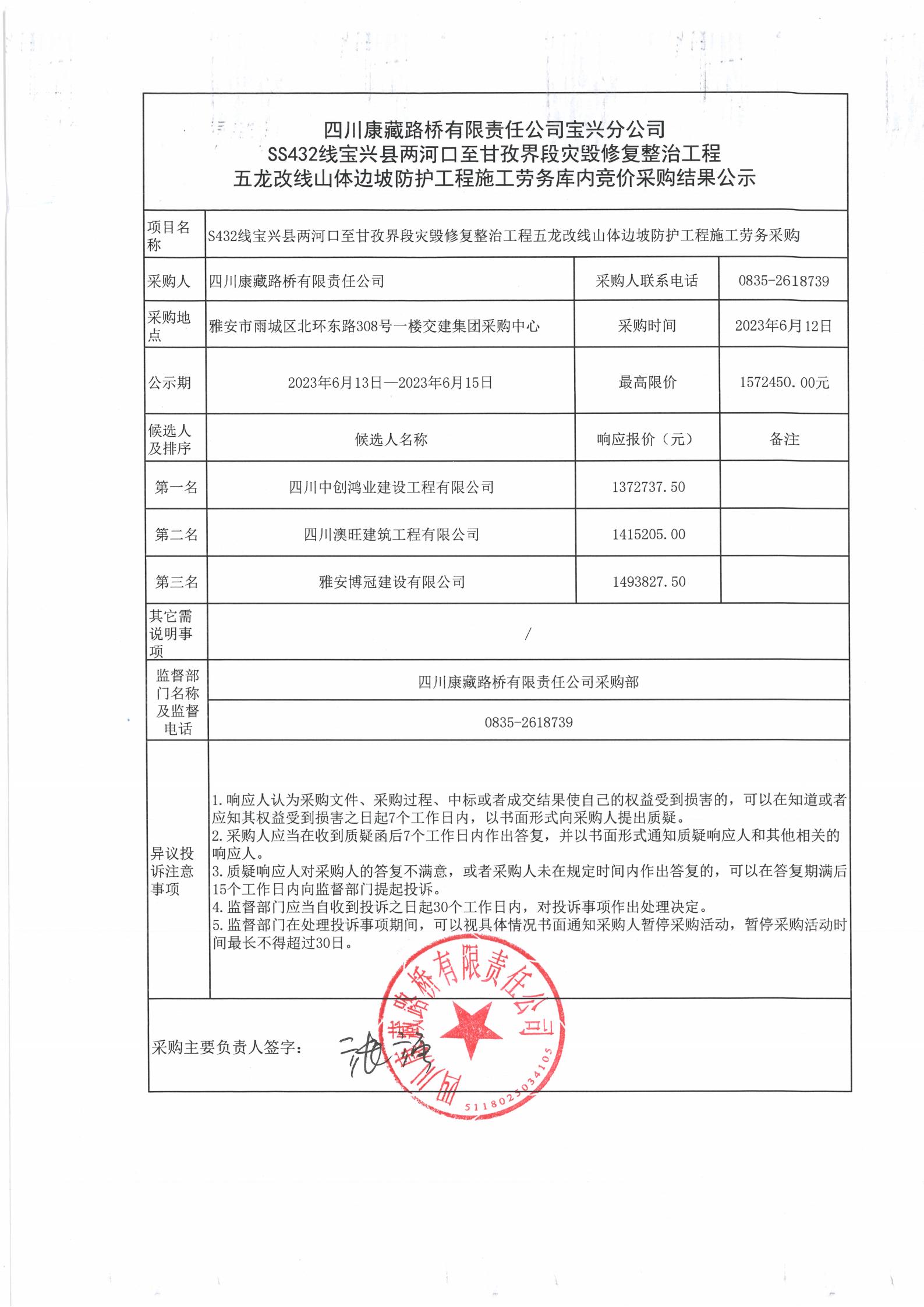 四川康藏路橋有限責(zé)任公司S432線寶興縣兩河口至甘孜界段災(zāi)毀修復(fù)整治工程五龍改線山體邊坡防護(hù)施工勞務(wù)庫內(nèi)競價(jià)采購結(jié)果公示