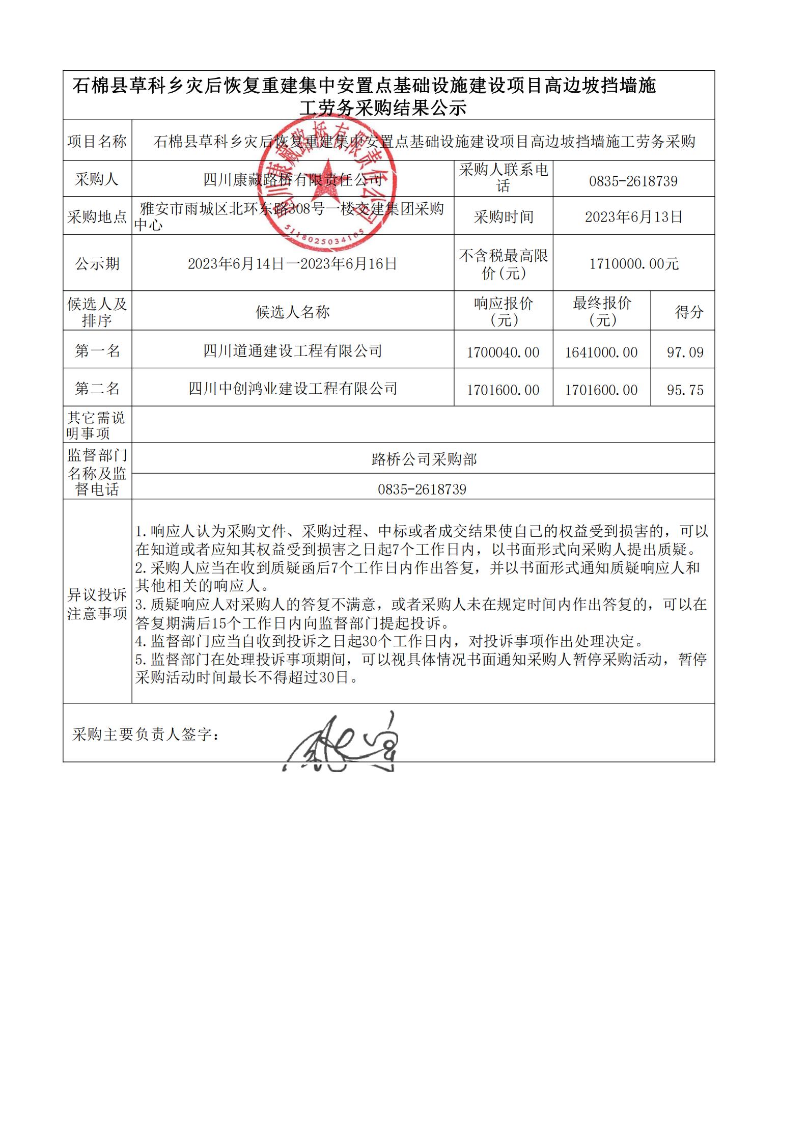 四川康藏路橋有限責任公司石棉縣草科鄉(xiāng)災后恢復重建集中安置點基礎設施建設項目高邊坡擋墻施工勞務采購結果公示