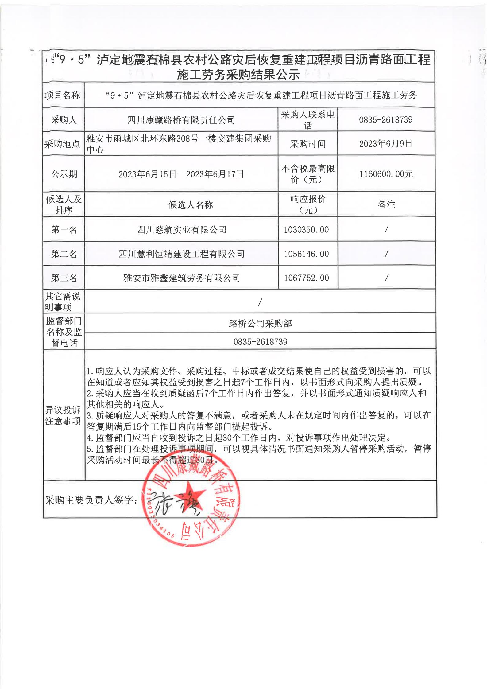 四川康藏路橋有限責(zé)任公司“9·5”瀘定地震石棉縣農(nóng)村公路災(zāi)后恢復(fù)重建工程項(xiàng)目瀝青路面工程施工勞務(wù)采購(gòu)結(jié)果公示