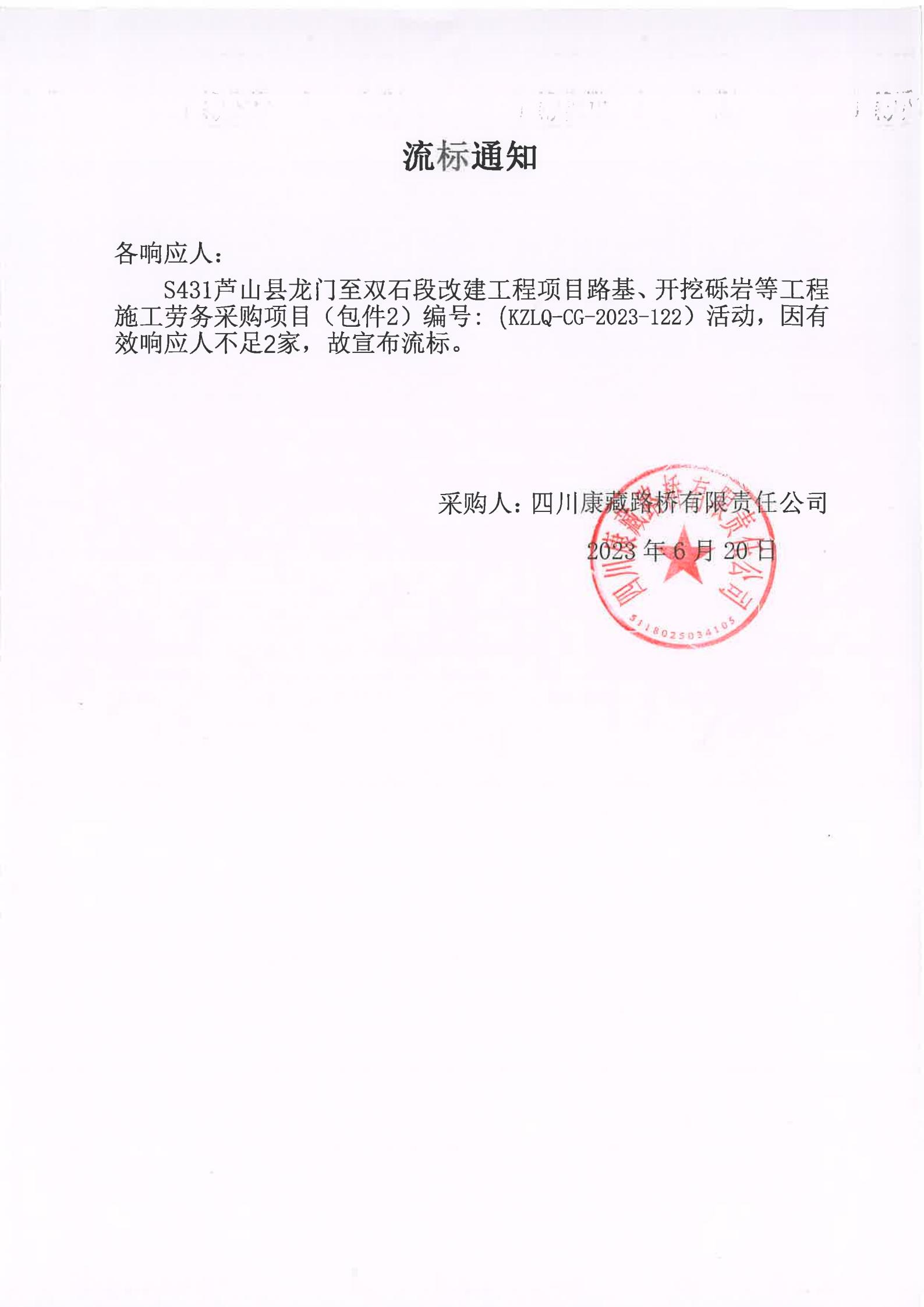 四川康藏路橋有限責(zé)任公司S431蘆山縣龍門至雙石段改建工程項目路基、開挖礫巖等工程施工勞務(wù)采購(包件2)流標通知