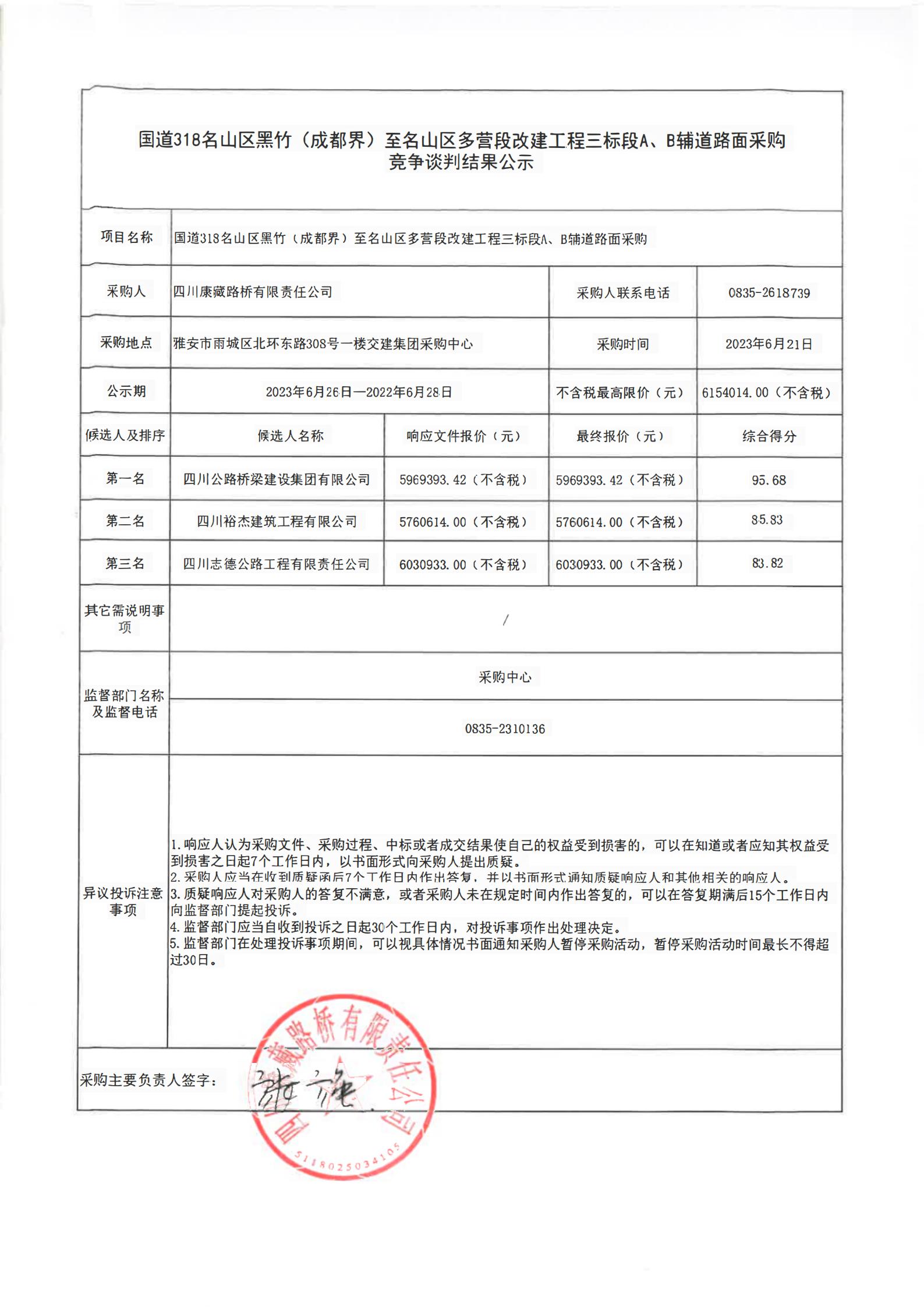 四川康藏路橋有限責任公司國道318名山區(qū)黑竹(成都界)至雨城區(qū)多營段改建工程三標段A、B輔道路面采購競爭談判結果公示