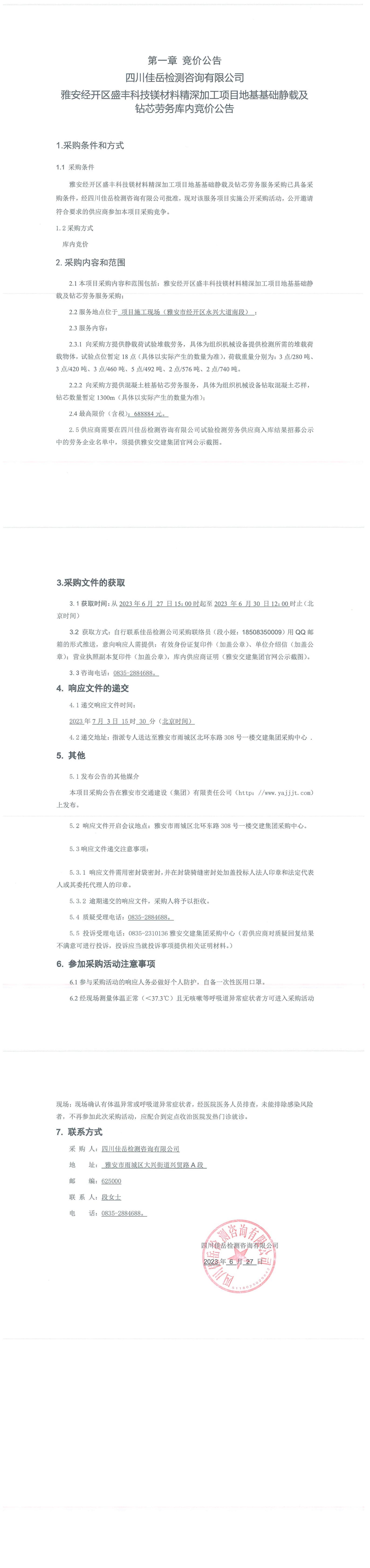 四川佳岳檢測(cè)咨詢(xún)有限公司雅安經(jīng)開(kāi)區(qū)盛豐科技鎂材料精深加工項(xiàng)目地基基礎(chǔ)靜載及鉆芯勞務(wù)庫(kù)內(nèi)競(jìng)價(jià)公告