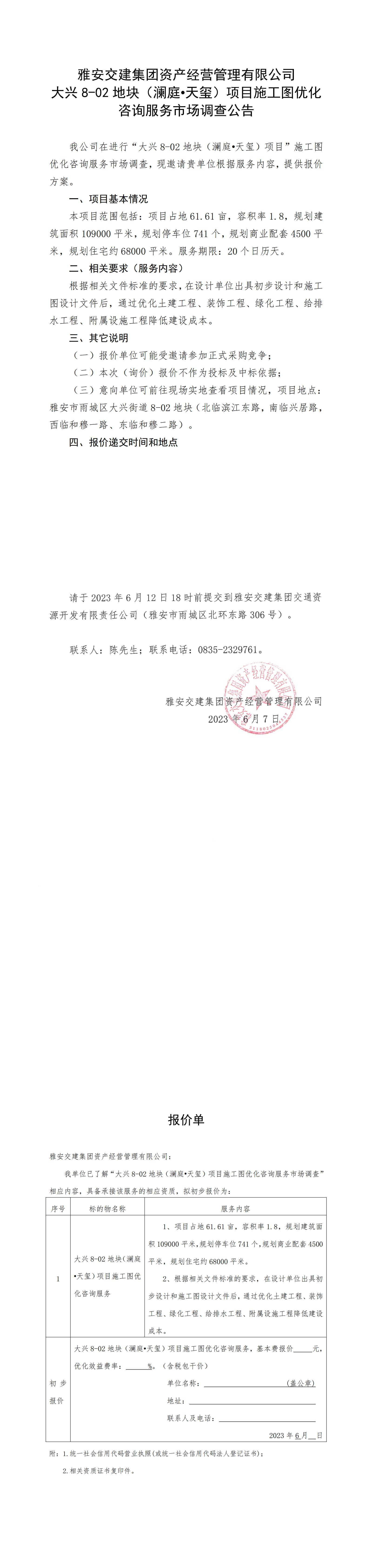 雅安交建集團資產(chǎn)經(jīng)營管理有限公司大興8-02地塊(瀾庭·天璽)項目施工圖優(yōu)化咨詢服務市場調查公告