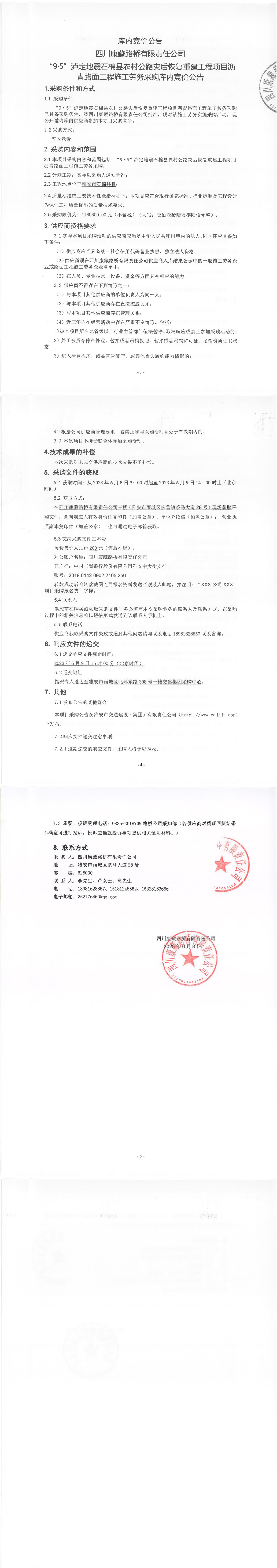 四川康藏路橋有限責(zé)任公司“9·5”瀘定地震石棉縣農(nóng)村公路災(zāi)后恢復(fù)重建工程項目瀝青路面工程施工勞務(wù)采購庫內(nèi)競價公告