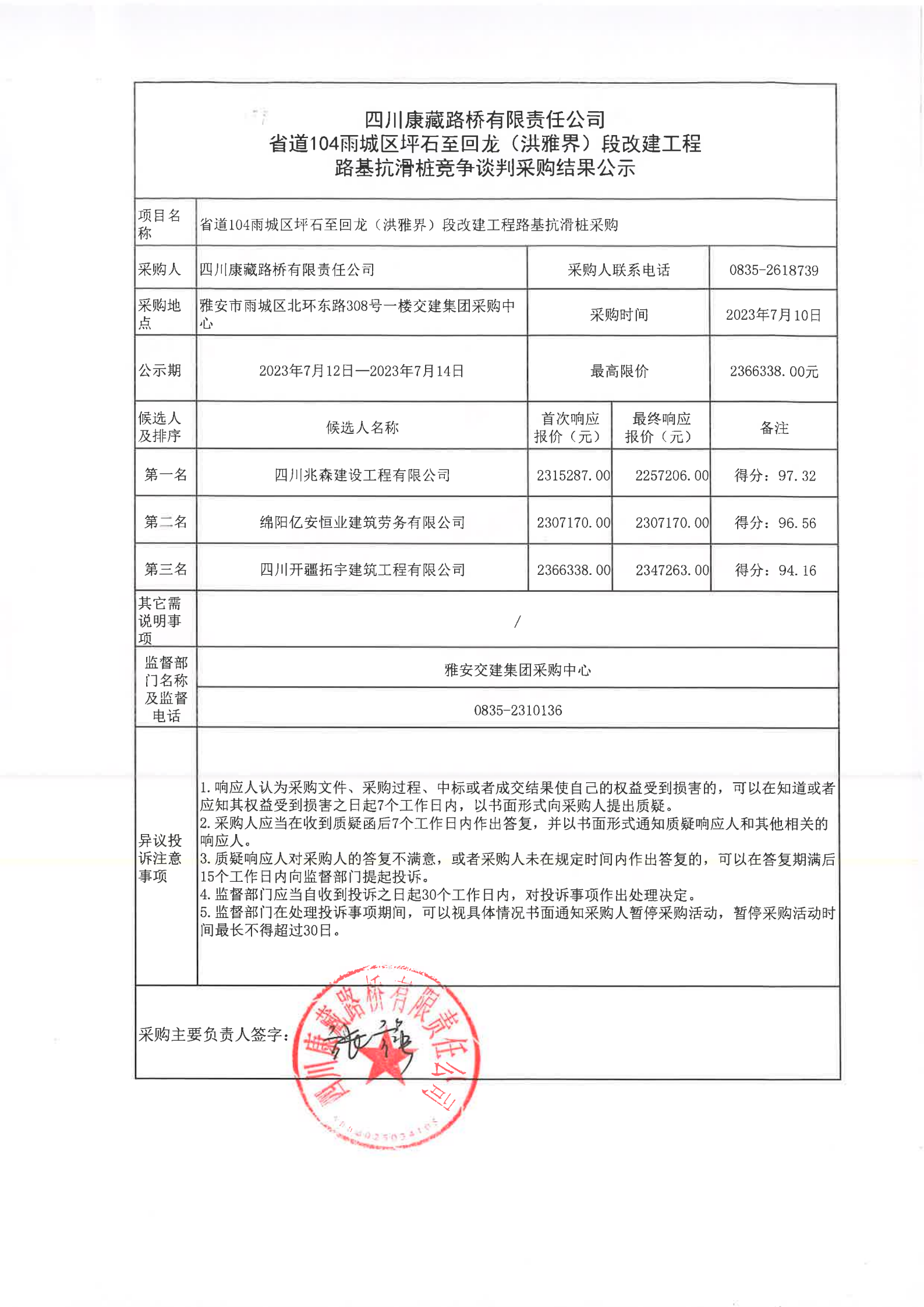 四川康藏路橋有限責(zé)任公司省道104雨城區(qū)坪石至回龍(洪雅界)段改建工程路基抗滑樁競(jìng)爭(zhēng)談判采購(gòu)結(jié)果公示