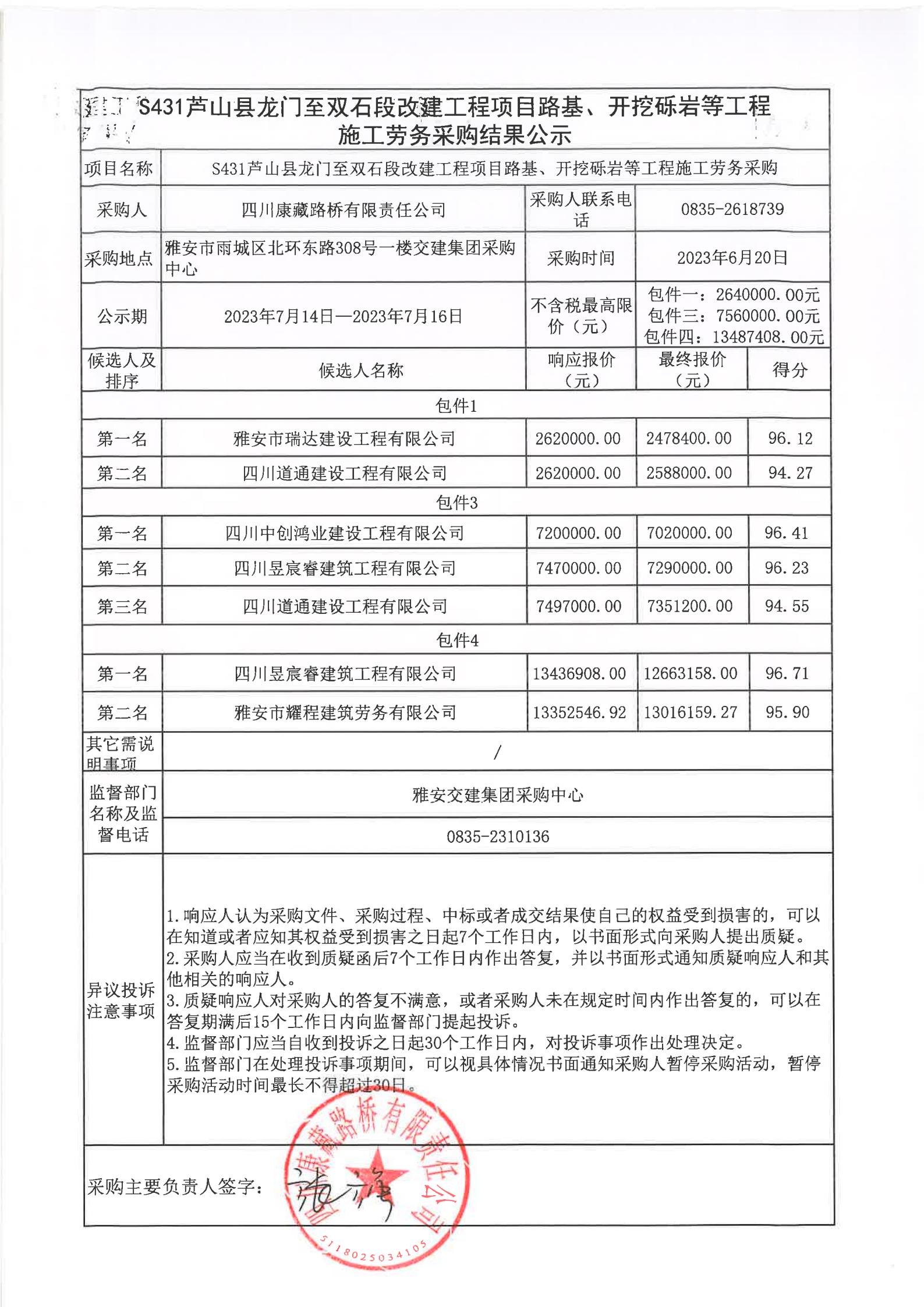 四川康藏路橋有限責任公司S431蘆山縣龍門至雙石段改建工程項目路基、開挖礫巖等工程施工勞務(wù)采購結(jié)果公示