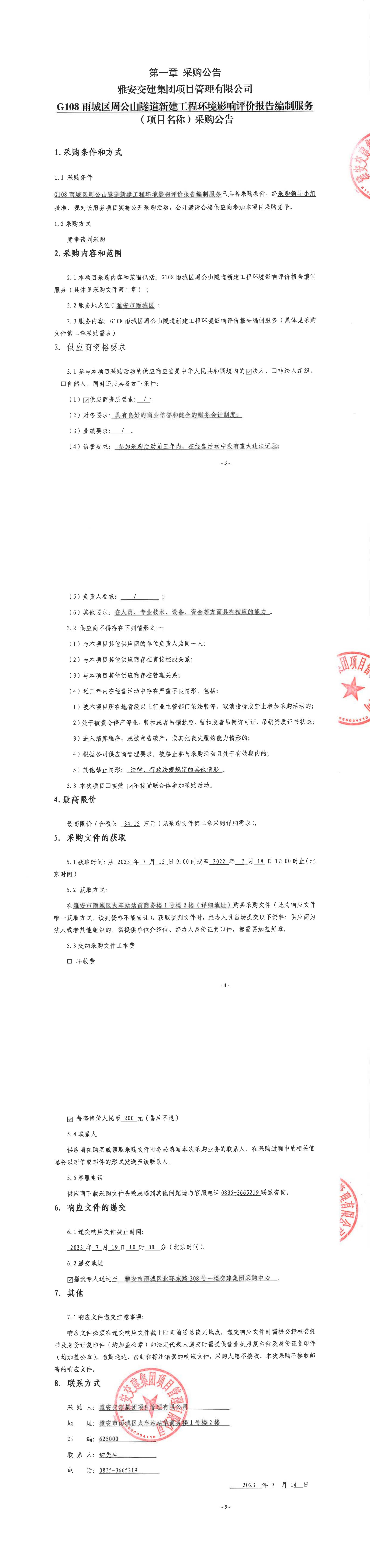 雅安交建集團(tuán)項(xiàng)目管理有限公司G108雨城區(qū)周公山隧道新建工程環(huán)境影響評價報(bào)告編制服務(wù)(項(xiàng)目名稱)采購公告